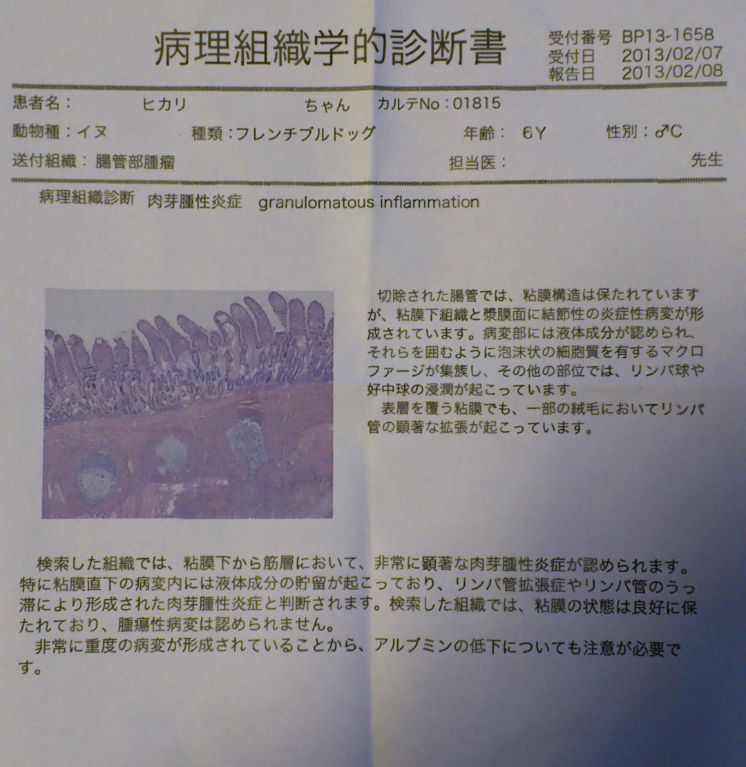 腸の組織の一部を採取して病理検査に出し、病名を特定する必要があるため開腹手術を行うことが決まり翌々日の2月4日(月)の午後に手術しそのまま2泊3日の入院となりました。