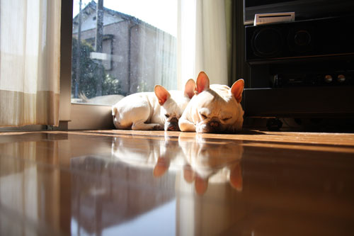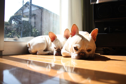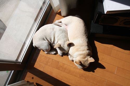 そんな飼い主に似たのか(もしかしたら飼い主が似たのかも…)2ブヒも日の当たるところでゴロゴロしっぱなし。