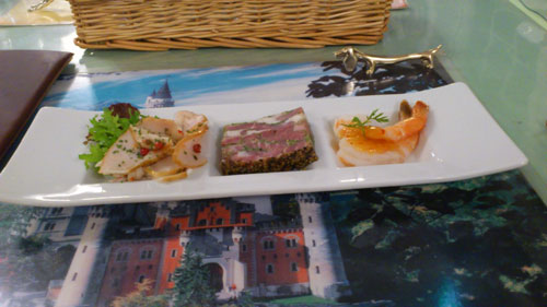 既に食卓には前菜が用意されていたので、早速いただきます。一品目は、ベーコン・ハム・海老など