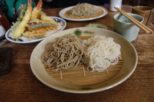 手前が相盛り蕎麦(さらしな蕎麦とおらが蕎麦の盛り合わせ)1,150円 奥が石臼挽き蕎麦 1,000円