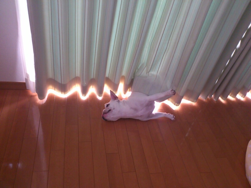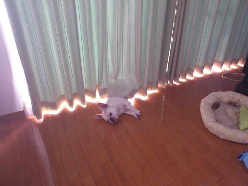 今日のひかりちゃんはカーテンを布団がわりに寝てました!