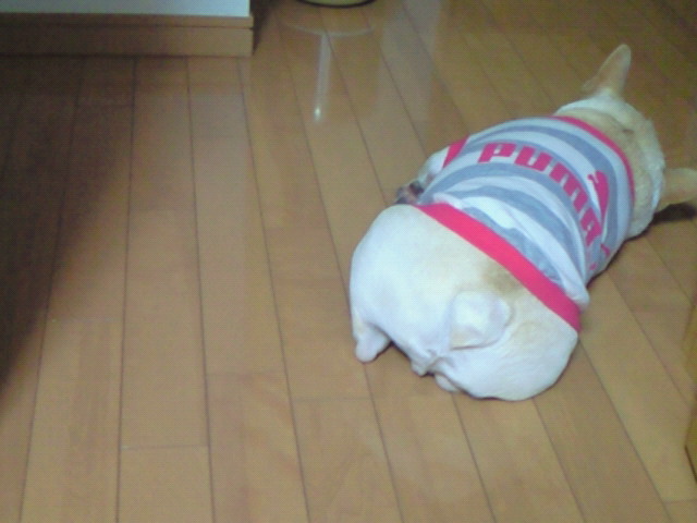 ニコサポーターは、暑くなってきたせいか廊下でゴロン。