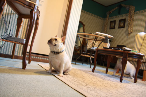 全面カーペット貼りの室内が、足腰にもやさしい!ニコ氏も満足そうです。