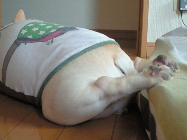 後ろ足だけかろうじて、お布団の上です。ど-したらこうなるんでしょう・・・