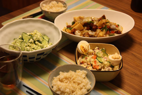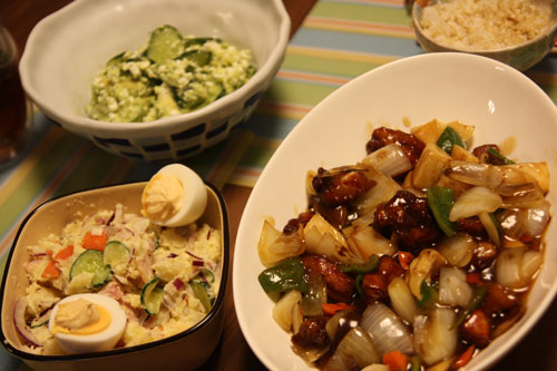 酢豚とポテトサラダにアボカドときゅうりのサラダ+玄米ご飯。