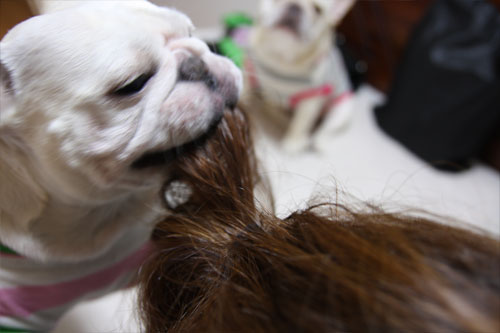 後ろでニコ氏も少し引き気味ですが、その歯がブラシの代わりをし、その唾液がトリートメントの役割を果たすとか果たさないとか…。