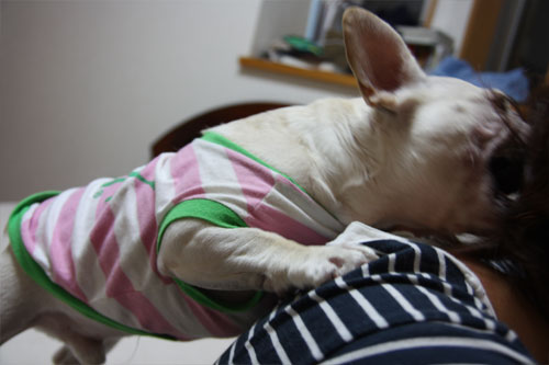 この日もパソコンに向かって作業する母の頭に噛り付き放しません!!!!
