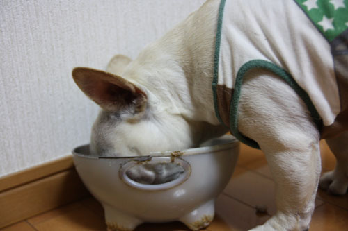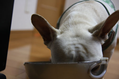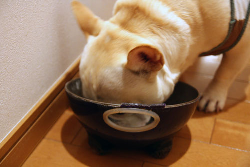 パピーの頃から使っているお気に入りのフードボール。既にボロボロです。
