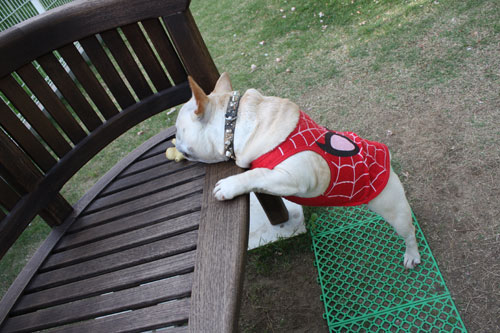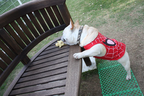 いつもであれば簡単に飛び乗ってしまう高さのベンチですが、今日はなんだかいつもと違うみたい。