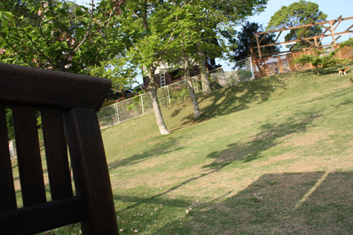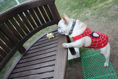 いつまで経ってもおもちゃを離さないので、無理やり取り上げて、ベンチの上に置いてみました。