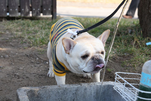 ドッグランに着く前に疲労困憊状態のニコ氏。給水ポイントで一服中です。