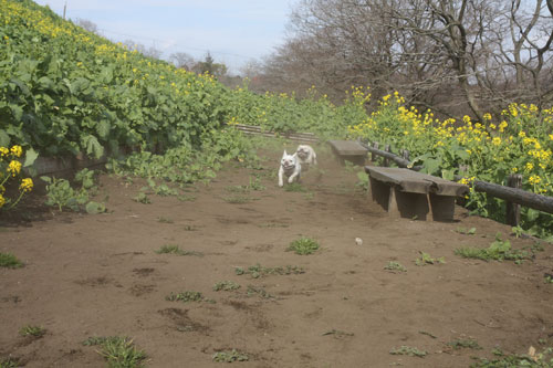 ドッグランでも他の動物たちとの触れ合いでもなく、菜の花畑で今日一番のハイライトを迎えました。
