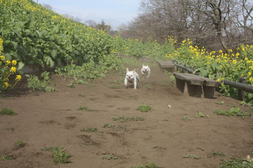 そうこうしている内に火がついてしまった2ブヒ。菜の花畑で大暴れ。