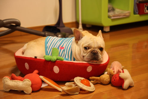 寝床にあるおもちゃは全てどけないと気がすまないようです。