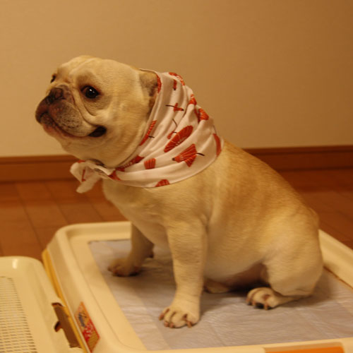 お散歩の際には保冷剤を首に巻いて暑さ対策をしているのですが、その際に使用しているのが「伊右衛門」についてくる手ぬぐい。