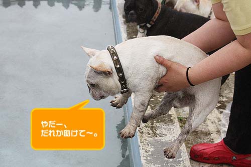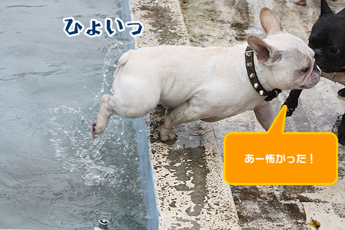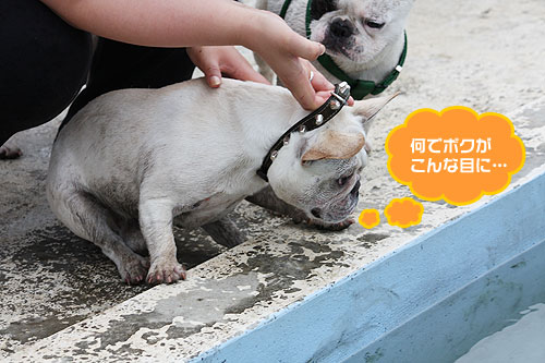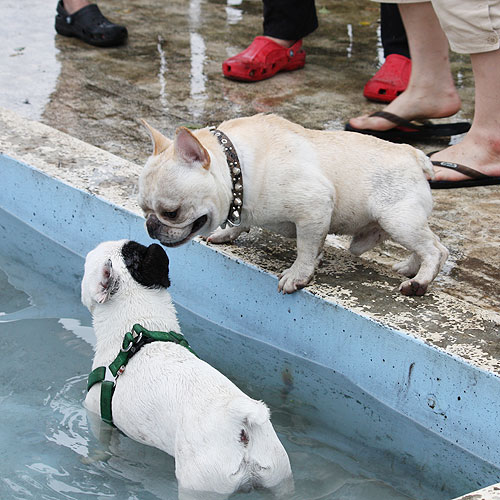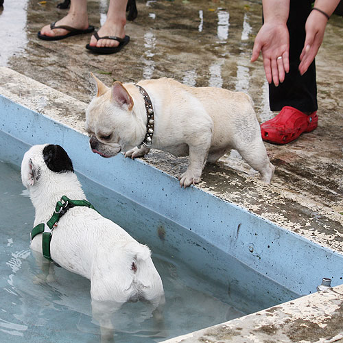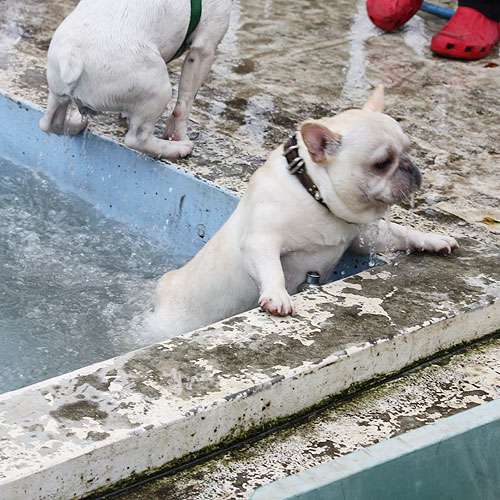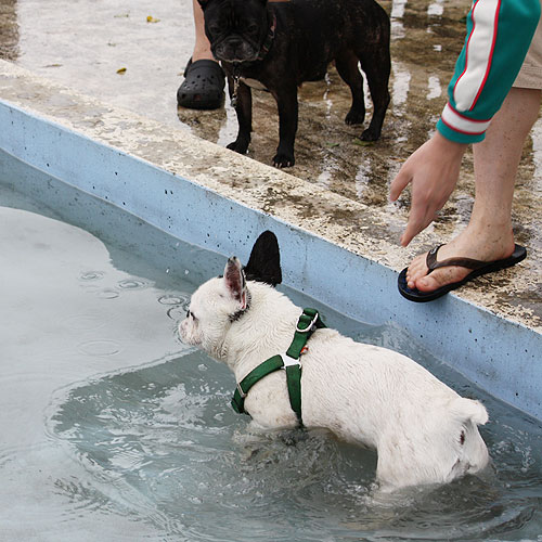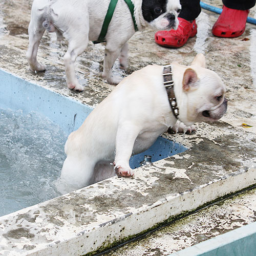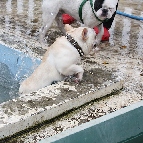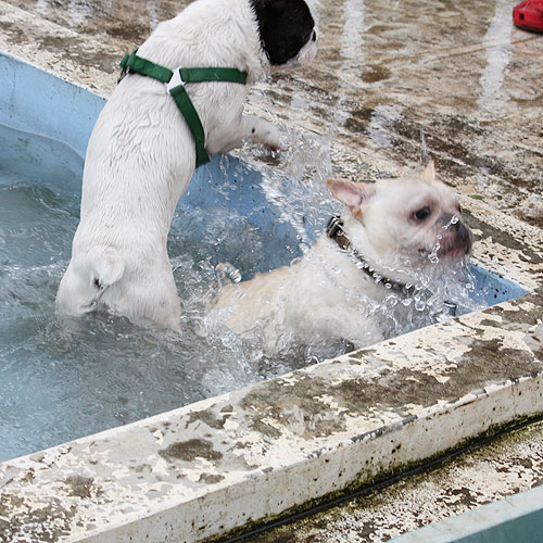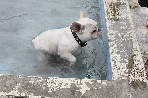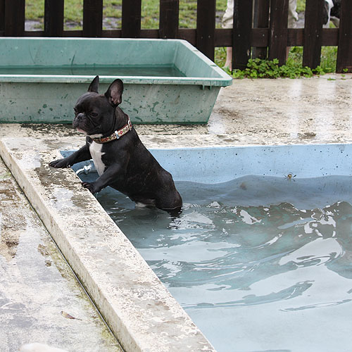 ドッグランで元気一杯走り回っていたブヒたちでしたが段々飽きてきたのか、ドッグラン脇にあるワンちゃん用プールに興味を示しはじめました。
