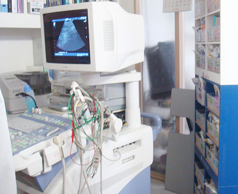 診察台の上でお腹の中を検査しています。